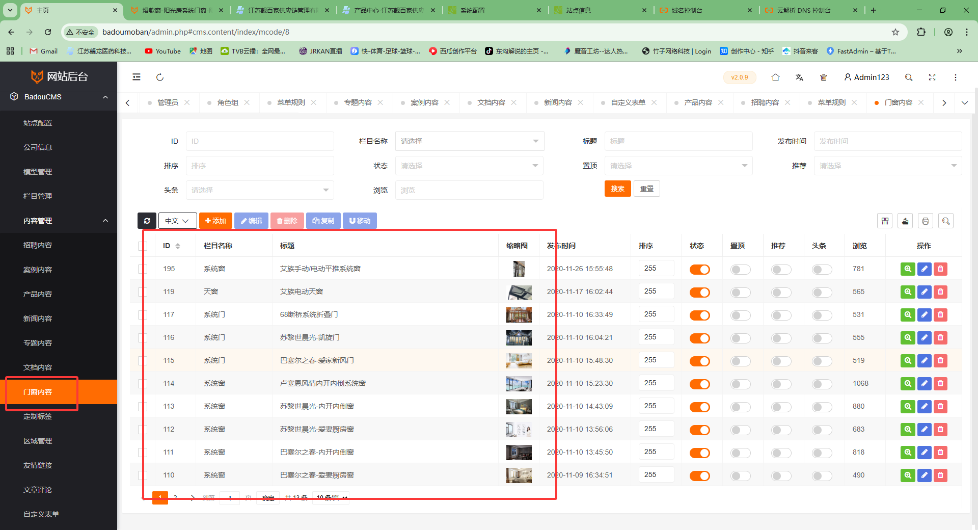 第一步:我们可以看到左侧的内容管理还是badoucms默认的部分,而右侧模型管理里面自定义的【门窗,大学,荣誉】在左侧都没有显示!